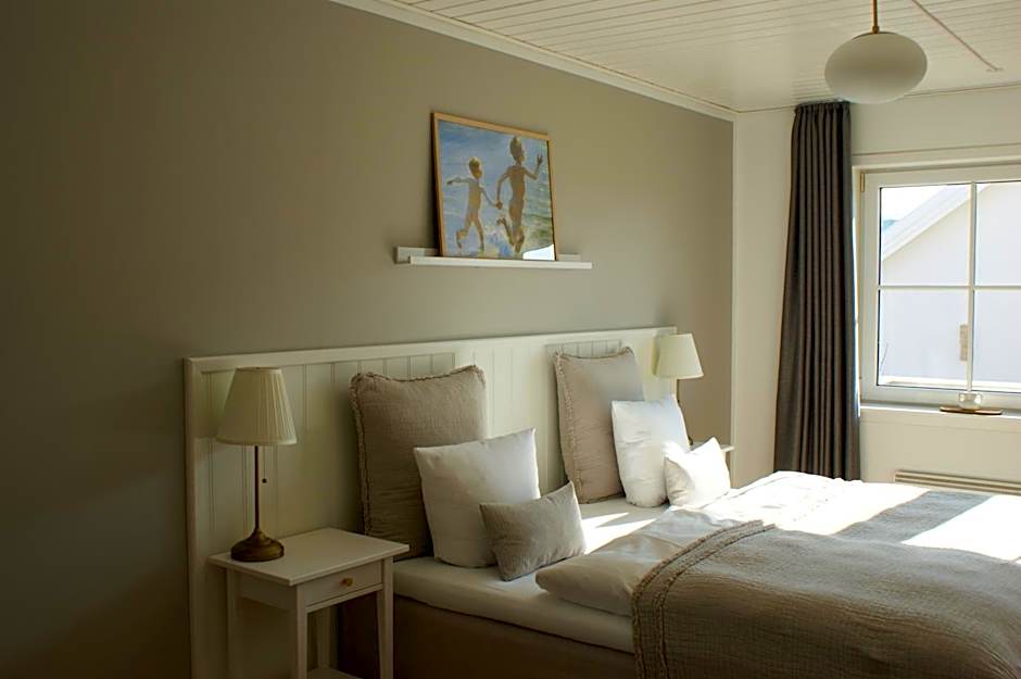 Painted in the typical yellow of Skagen, the hotel is located a little outside the main town with parking areas. Very easy to walk to town from the hotel. Upon arrival we were greeted with a smile, and a room upgrade. Room 2 is at the front of the hotel, with a small balcony and looked brand new. The bed was very comfortable, the styling coastal and Scandi. Very quiet at night. Breakfast was excellent, lots of quality fresh choices, plenty of hot tea and coffee. We stayed two nights, and felt more like we were staying with family, than a hotel. We especially loved having our breakfast in the sunny dining room that still features original paintings.