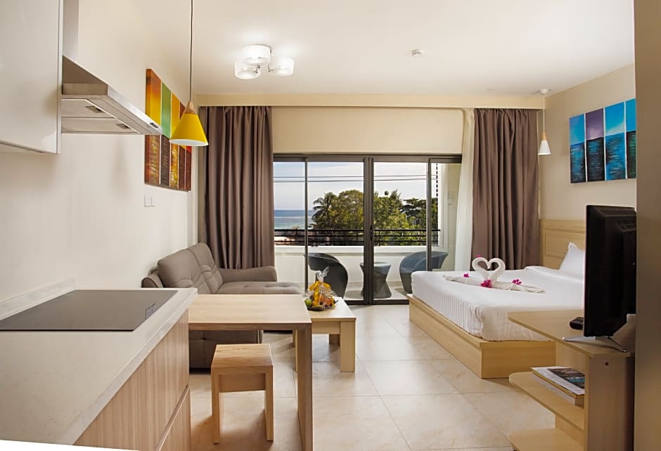 Offers full kitchen, living area and private terrace.