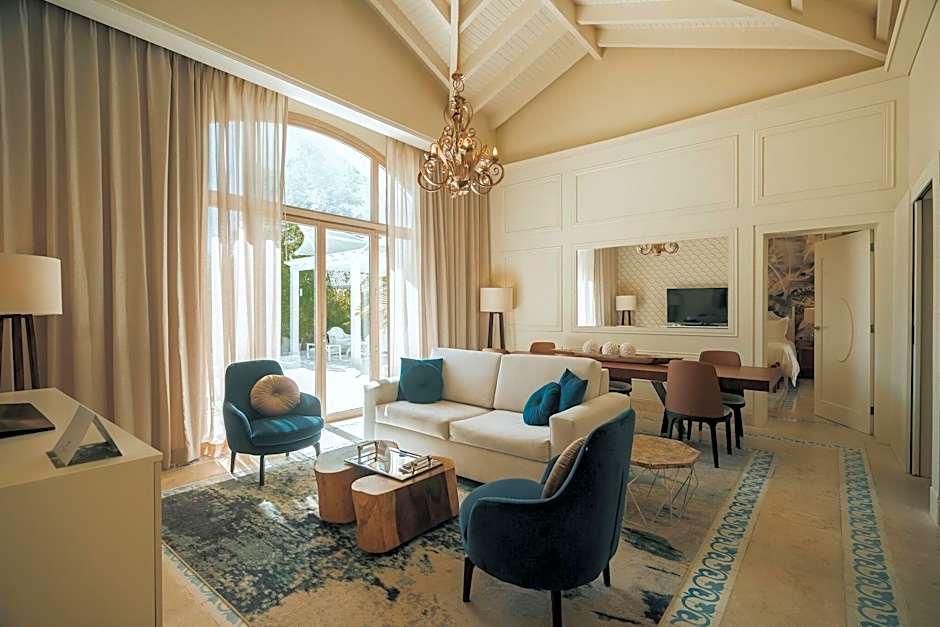 The hotel offers a variety of suite options including the Luxury Pool Family Suite, Luxury Pool One-Bedroom Suite, Luxury Pool Junior Suite, Beachfront One-Bedroom Suite, Two-Bedroom Villa, and Beachfront Two-Bedroom Suite. All rooms are non-smoking and can accommodate a range of guests from 3 adults and 2 children to 10 adults and 2 children. Bed sizes include king size, queen size, double beds, and sofa beds.