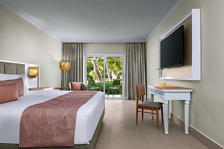 Located on the ground floor, this spacious Deluxe Swim-Out room offers a king-size bed, pool towels and a terrace with lounge chairs and direct walk-out access to the pool.
