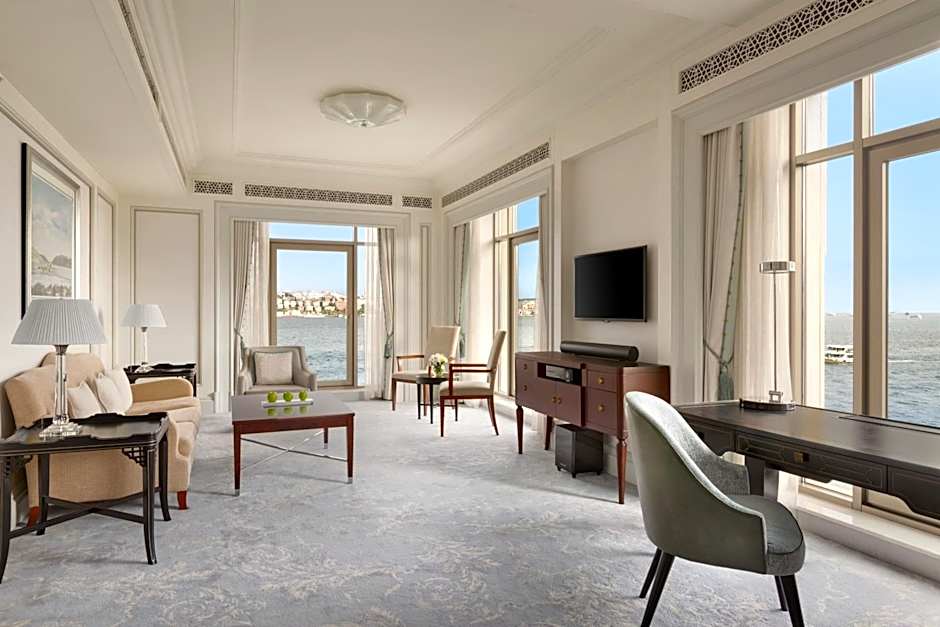A luxurious air-conditioned room with city views and free Wi-Fi, decorated with draped curtains and crystal chandeliers, and featuring a spacious living room area.