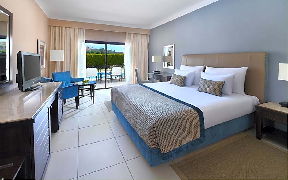 The room features a balcony with pool views, a living room, a satellite TV and mini-bar.