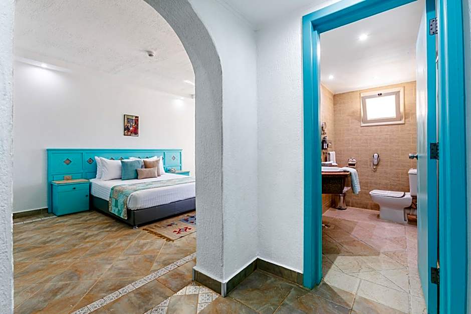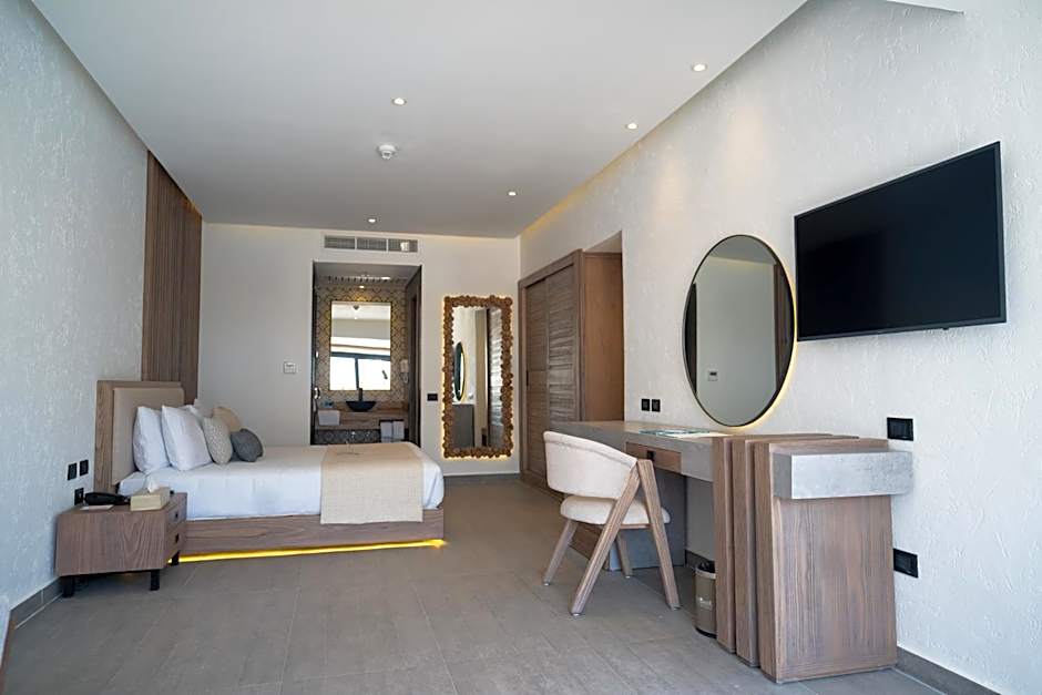 The room features a bedroom with a king size bed or twin beds, a bathroom with a shower, a small seating area, and a terrace or balcony. The room also offers free toiletries, free WiFi, a satellite LED TV, a safe box, tea and coffee facilities and a mini-bar.