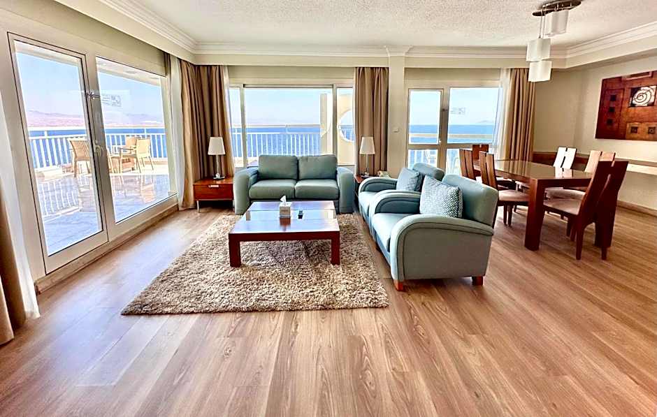 The King Coral Suite offers a terrace, extra space, full sea view and a living room. The suite measures to be 42 sq. m / 452 sq. ft. double balcony of the King Corals Suite showcases the historic Gulf of Aqaba. You’ll also enjoy a view of the Sinai Mountains. Located in the main building, this high-floor suite offering an additional 18 square yards than the standard rooms. The marble bathroom includes a hand-held shower, a telephone and fluffy towels. Room service and housekeeping services are always available. Take your time rising from the comfortable king-sized bed in the private bedroom, sipping a hot beverage from the tea and coffee making facilities. WiFi access and a mini-bar are available (fees apply). This suite sleeps 2 Adults + 2 Child or 3 Adults + 1 Child.