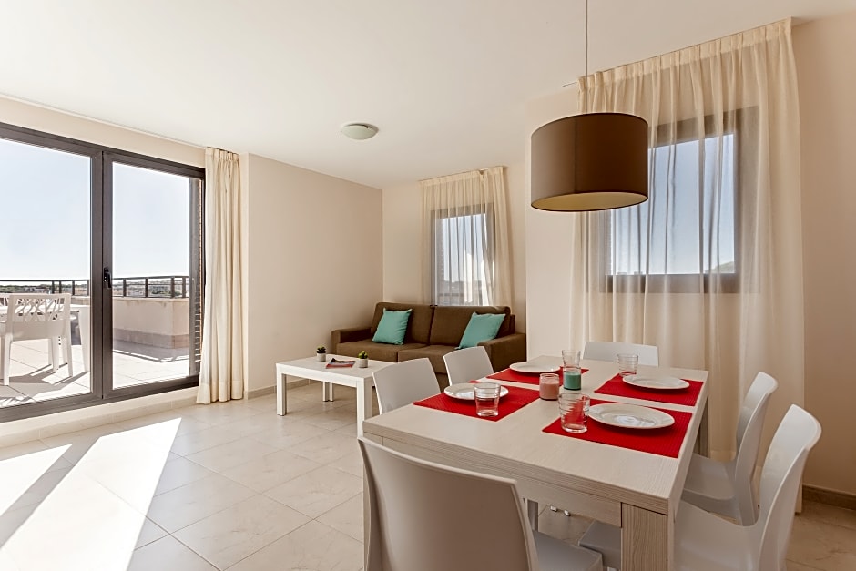 The apartments are very spacious with large balconies (we had a standard apartment for 6 but there are also options for superior with larger balconies/terraces.) There is a bathroom and a shower room so great for larger families. Fully equipped kitchen with a dishwasher and washing machine. Sleeping arrangements: first bedroom has a double, second has 2 singles and the large sofa bed in the living area also has a pull out trundle bed. 2 pools which were warm and sun loungers available. We stayed for 2 weeks and had numerous towel changes and new bedding half way through the stay. There is an option to park inside the complex or next door in the public car park, which is slightly cheaper. Gated access so felt very safe with our 4 children. Location couldn't be better. Far away enough from the strip so it is quiet but literally a 10 minute stroll to the shops, touristy bits and lovely beach. Close to all public transport too if you're not driving. Would highly recommend and we hope to return in the future. Thanks again for a memorable stay,!