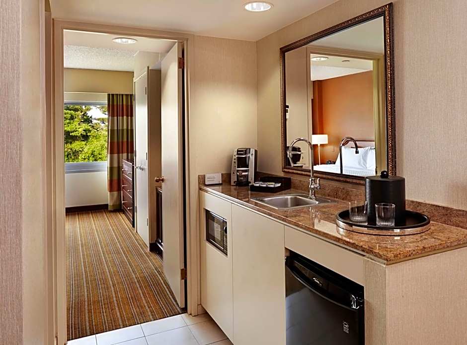 The property was so beautiful, with a lovely garden in the center with brick pathways winding through the gazebo and greenery We had a King Suite and there was so much room! The bed was comfy and the room quiet. There was a nice office/den there and the shower had great water pressure! I wish my shower at home had as much! The snacks and drinks provided every day were a great surprise and we really appreciated them. We used the gym and it was well appointed and clean. Sadly, our stay wasn’t long enough to be able to use the pool, but it looked like a nice. The breakfast was delicious. The only disappointment was that there were no sugar free items like jelly or syrup put out. As a Diabetic, it’s embarrassing to have to ask for them. We were here for a matinee in NYC and it was easy to drive 15 minutes to pick up the train to the city (it is at Montclair State University) and about 40 minutes into the city! Last off, the people at the front desk were very welcoming and helpful. They were the only employees that we interacted with. I can tell you that our next trip to the area will be spent at the Embassy suites Parsippany!