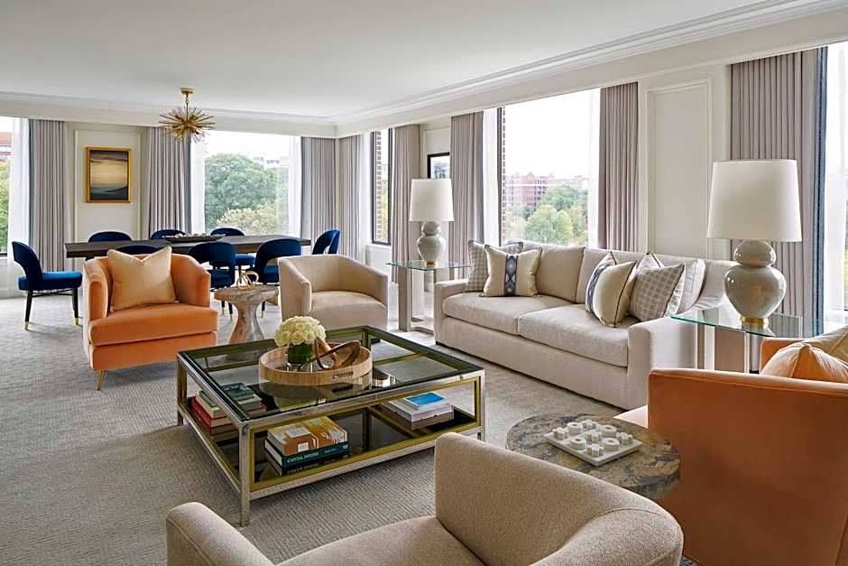 Una selección de suites y habitaciones espaciosas muestra la variedad de la propiedad. Entre las opciones destacadas se encuentran la Suite Presidencial (1,927 pies cuadrados), la Suite Georgetown de un dormitorio (900 pies cuadrados), la Suite Georgetown (900 pies cuadrados) y la Suite con vista a la capital (1,098 pies cuadrados). Estas opciones atienden a parejas que buscan lujo, familias que necesitan espacio y viajeros de negocios por igual, asegurando una base cómoda en el corazón de Washington. Con la ciudad a solo un corto trayecto y un ambiente refinado al que regresar, estos alojamientos invitan a los huéspedes a quedarse un poco más.