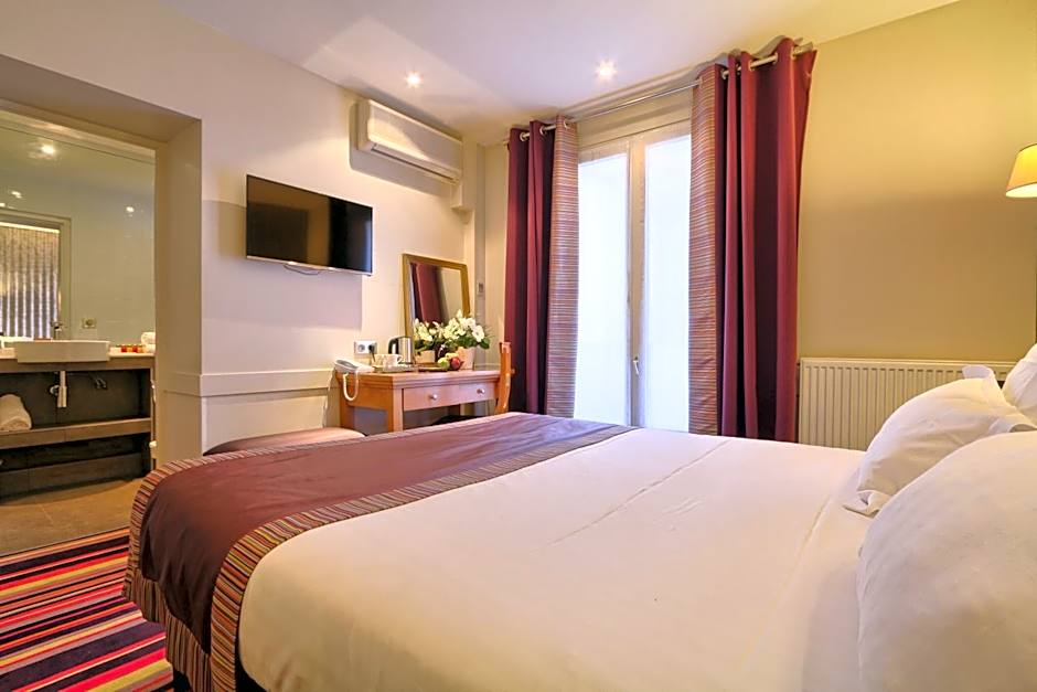 The hotel is located on a small side street and you enter the street through an archway. This creates a buffer from the noise and bustle of the area. There are lots of great food options in the area, as well as covered pedestrian "passages" with shops. You can walk to Mont Marte (~ 1-2 miles). The Metro is easily accessible. Our room, with a second small bed for our daughter was nicely arranged.