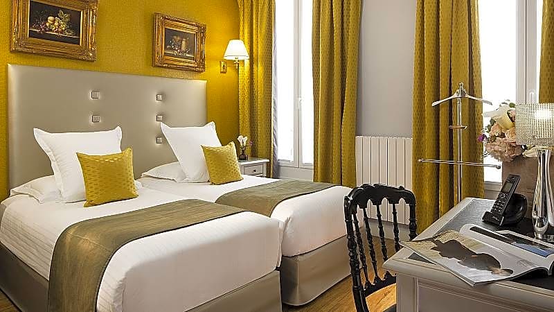 I was pleasantly surprised at the cleanliness and general room and hotel ! In paris hotels are usually worn down old and smell of mold. This hotel seemed brand new room was great, beds were super comfy . Quiet room even though it's a busy street. The fact that it was a fee minutes walk from champs elysees was amazing ! The buses that go to eiffel tower and gallerie lafayette are at the door ! Perfect location ! Will definitely stay there again !