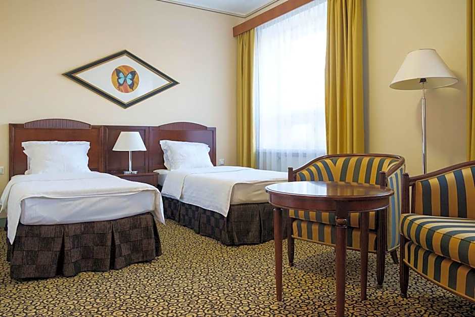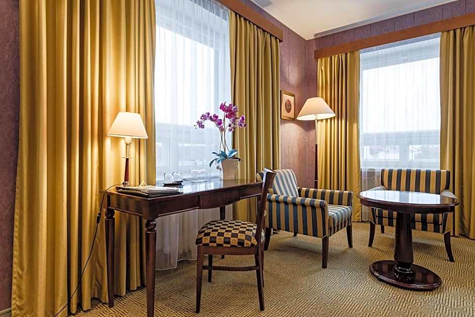 Grand Hotel Viljandi offers a variety of room types including Single Rooms, Junior Suites, Presidential Suites, Large Double Rooms, and Twin Rooms. The Single Room accommodates 1 adult, while the Junior Suite, Presidential Suite, Large Double Room, and Twin Room can accommodate 2 adults. The Junior Suite, Presidential Suite, and Twin Room also have the option to accommodate 2 children. None of the rooms allow smoking and the beds range from Twin to Queen size. Room sizes range from 194 sqft for the Single Room to 463 sqft for the Presidential Suite.