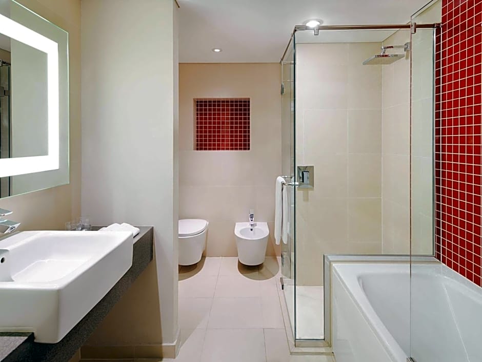 Valmistaudu ottamaan aurinkoa ja uppoutumaan rentoutumiseen kohteessa Novotel Dubai Al Barsha, jossa kaksi upeaa ulkoallasta odottavat polskutteluseikkailujasi! Yksi allas on suunniteltu erityisesti lapsille, mataline reunoineen — pienet uimarit saavat paljon iloa potkiskella, nauraa ja tehdä ihania muistoja. Aikuisille on lämmitetty ulkoallas, josta avautuu panoraamanäkymä Dubaista kohoavaan upeaan kaupunkisiluettiin. Kuvittele itsesi aurinkotuolissa, cocktail kädessä, nauttimassa auringon lämmöstä samalla kun kaupunki avautuu ympärilläsi.