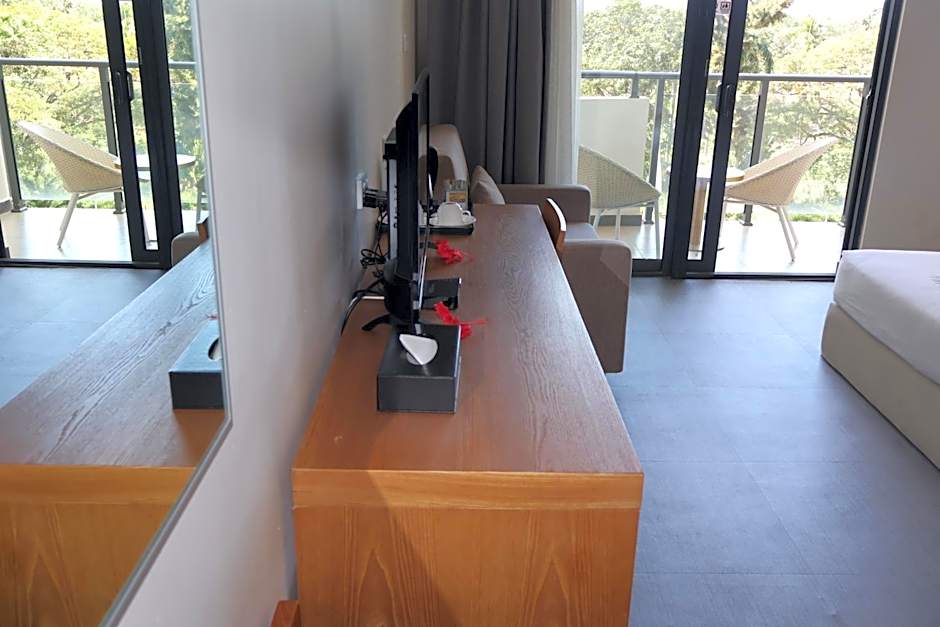 This air-conditioned room has a writing desk and chair, coffee table with two chairs, tea and coffee facilities, mini fridge, flat-screen TV, fan, private bathroom with walk in shower, bathroom amenities and a private balcony with table and two chairs.