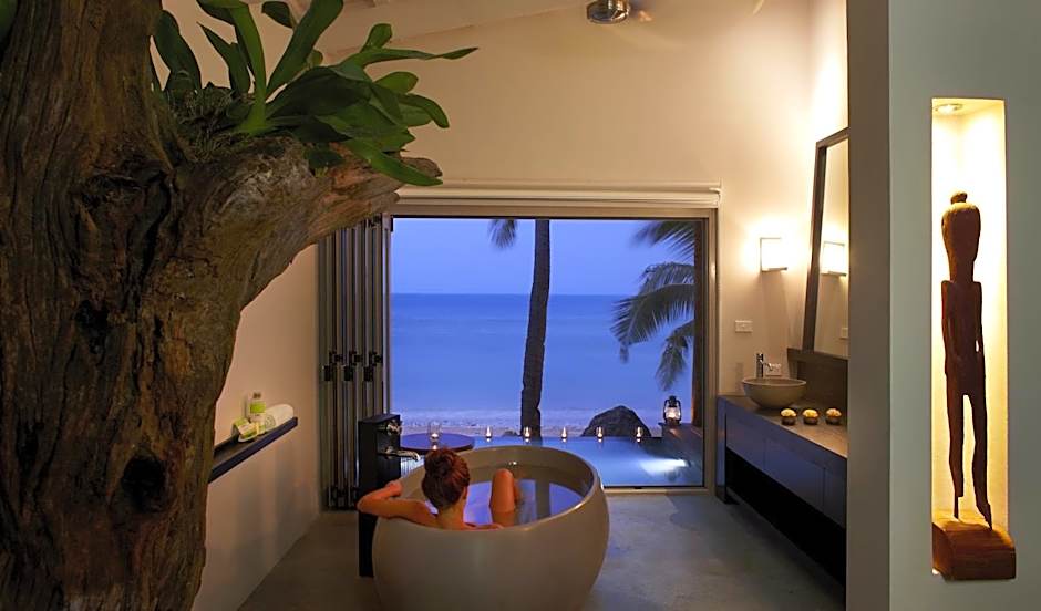 This all inclusive, adult only villa offers 1 extra large double bed. It has a private pool, a balcony and a luxury bathroom with a bath tub.