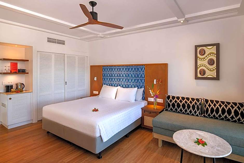At Outrigger Fiji Beach Resort, guests can spend their time enjoying a range of leisure amenities. They can relax by the lagoon-style swimming pool, indulge in a pampering treatment at the Bebe Spa, or take part in various water sports like snorkeling and kayaking at the beach. For those looking to stay active, there are tennis courts and a fitness center available. Families can also enjoy the Meimei nannies (for a fee) and complimentary kids club, offering fun activities for younger guests. In the evenings, guests can unwind with a cocktail at one of the resort's bars or enjoy a cultural show featuring traditional Fijian music and dance.