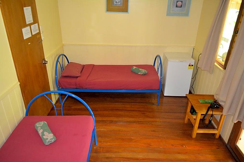 This room includes 2 single-sized bed with tranquil lilypond view. It has access to shared bathroom facilities and also includes a ceiling fan, bar fridge, direct veranda access and free WiFi.