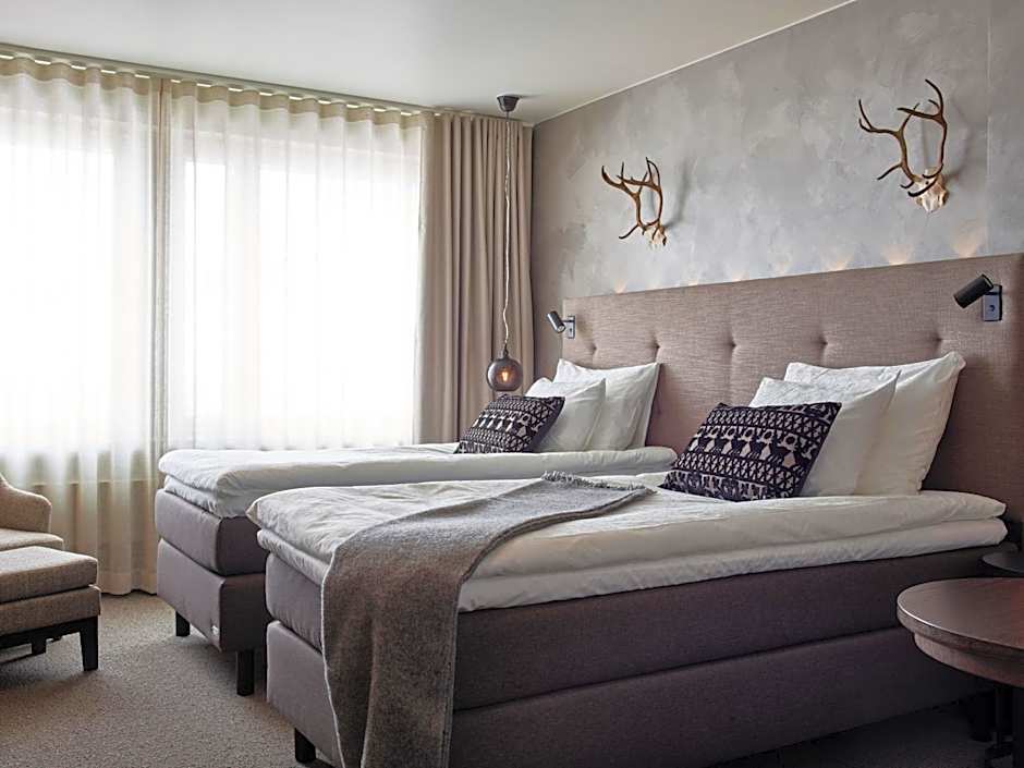Arctic Deluxe Spa is 398 square feet and includes either a king-size bed 150-183 width or 2 single beds 80-130 width plus hairdryer, tea and coffee making facilities , ironing set, safe, and bathrobes.
