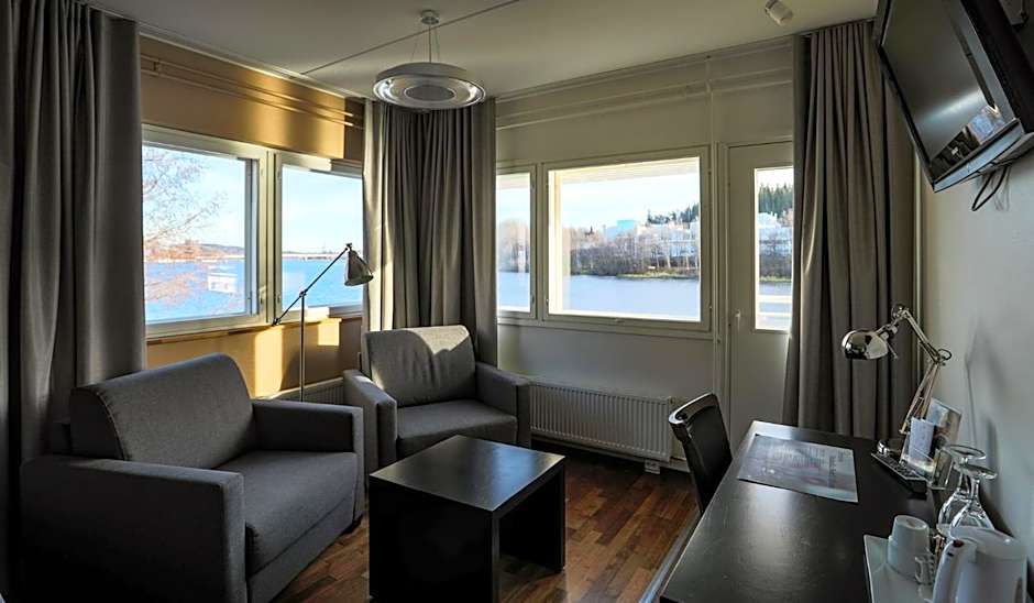 Spacious suite with a private sauna and a French balcony overlooking Lake Jyväsjärvi.