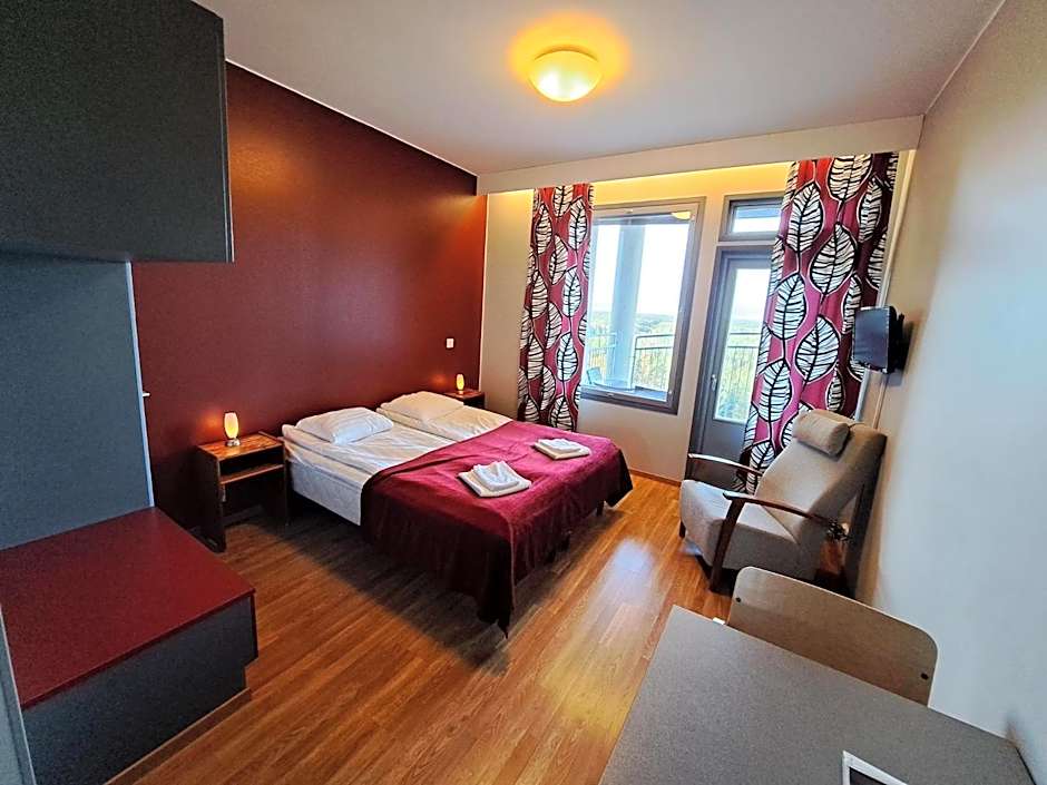 • A kitchenette with a stove, fridge and coffee maker. • Living room with a seating area and flat-screen TV with DVD player. • A toilet room and a shower room by the electric sauna. • A private balcony with views of the surroundings.