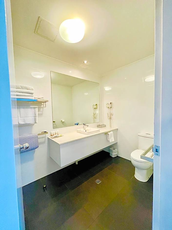 The room was very clean on arrival, and surprisingly large, The bathroom was extra large also, with a walk in shower. The bed is very comfortable, and the facilities (kettle etc) are in great condition. Location is just outside the CBD (a short walk) and there is a McD's a 3 minute walk down the hill. Off street parking is available, but not necessarily adjacent to your room. All in all, good value, clean, comfortable and quiet.