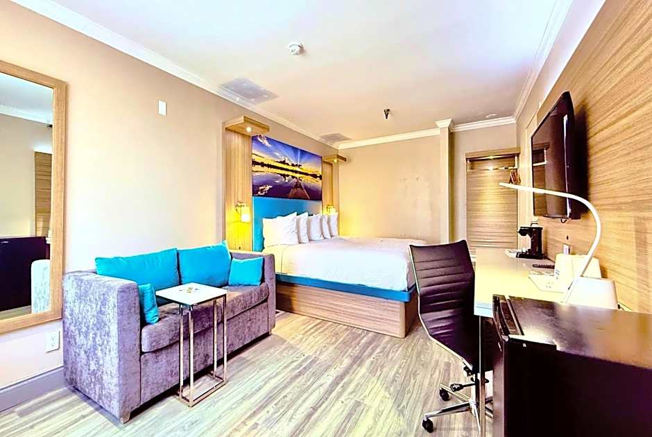 Vous vous sentez un peu indulgent ? Découvrez les chambres Deluxe King qui sont équipées de tous les avantages auxquels vous vous attendez ! Que vous choisissiez une option fumeur ou non-fumeur, ces espaces vastes (un impressionnant 27 m²) offrent amplement de place pour se détendre après une longue journée sous le soleil californien. De plus, se prélasser dans un bain luxueux après une journée d'exploration est la cerise sur le gâteau de vos aventures ! Préparez-vous à vous détendre et à profiter de tout le confort pour rendre votre séjour aussi agréable que possible.