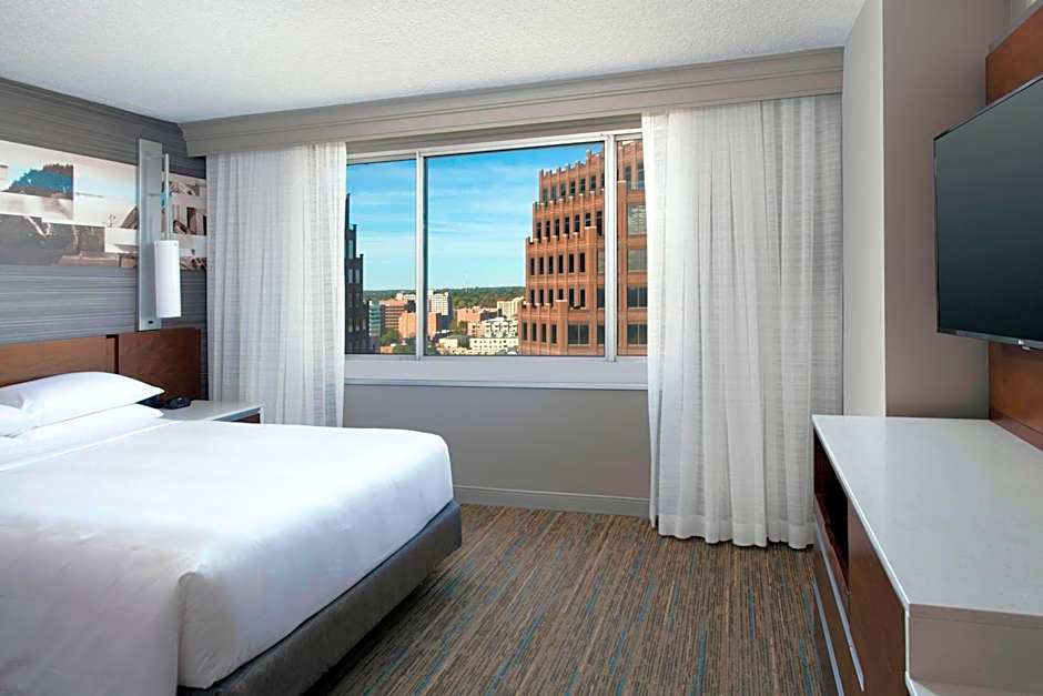 Got a free room upgrade. Very nice spacious room. Clean facility throughout. Sucks to pay for parking and there is lots of construction on Main Street. Shower drained very slowly but overall a great stay.