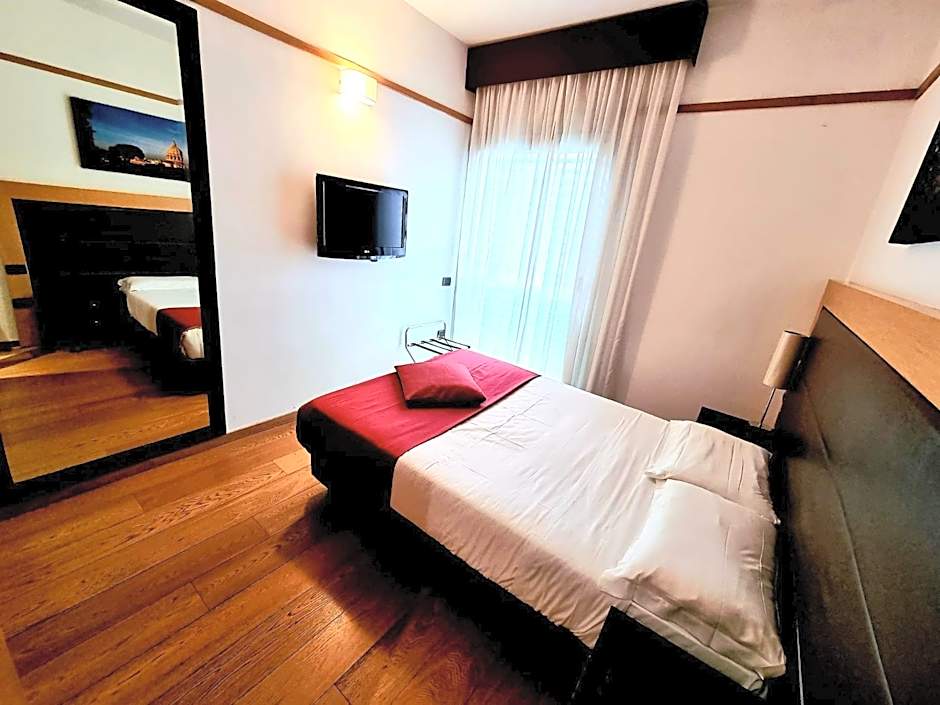 The hotel is in a pretty good place, you can get to the Battistini metro station in like 10-12 minutes by foot. The neighbourhood was rather quiet and calm. The hotel has a garage (15€ per day), but you can very easily park on the street free of charge, there isn't much traffic there and it isn't as sketchy as other parts of the city can be. Our room wasn't very big, but appropriate for the price, it's big enough if you're staying only for a few days. Breakfast is simple, but again, price appropriate. Check in time is from 2PM, but we could check in earlier at 10AM which was great, because we could settle down right after a long trip without having to wait. Staff is very friendly! I travel to Rome once a year to attend Lazio football games, and will definitely stay here the next time I go. Very much recommended for people who want to stay in the city for a reasonable price!