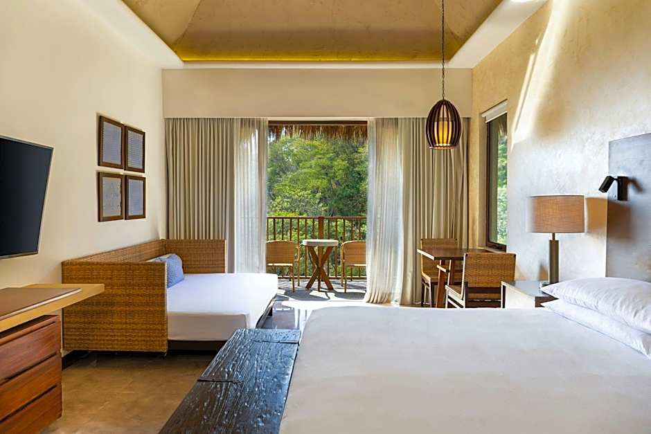 We loved waking up on the mountainside. The location of the hotel is beautiful! For the price we paid the food was on par but could've been better. The guitar duo in the sports bar was great and we really enjoyed listening to them. If you're there on the weekend they have a taco truck which I think was the best food we had. The beach club has a better lunch than the hotel lunch restaurant. I'm not vegan but the vegan ceviche was very good! Being in the tree canopy is just beautiful. We liked the almost individual sized pools.