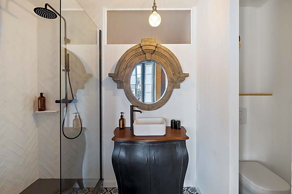 A beautifully-decorated and spacious bedroom with big bathroom and walk-in shower. This room is one of three in a secure-entry space in a heritage-listed art deco building. Located in a quiet and classy area of Bayonne, there is a small supermarket and Boulangerie within 100metres. The city centre is less than 10 minutes on foot. The split facility has a shared kitchen, well-equipped with large fridge, microwave and light cooking abilities, china and cutlery. The room has a comfortable sitting area. Parking was right outside the building street side but private parking is also available within 100 metres. There is a lift. A thoroughly enjoyable stay.