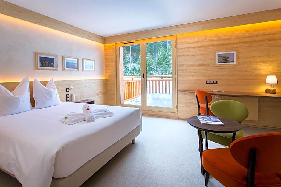 Soundproof rooms keep nights quiet after a day on the slopes, while balconies offer mountain or garden views to sip morning coffee and watch the day begin. The setup also includes non-smoking rooms, elevator access, a sun deck, a terrace, a garden, and a playground, creating a welcoming setup for all ages.