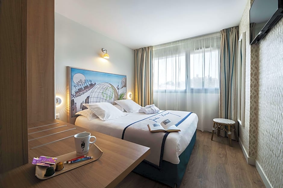 The first four things a good hotel needs to provide are: a) Communication before you arrive b) A quiet room c) A comfortable bed d) A good shower. Everything after this is a bonus. The Jules Verne delivered with excellence these four, however on top of that the staff were very friendly and helpful. I needed their help on a few things and they willingly assisted. Some other bonus things - there is a good parking garage which is pre-bookable below the hotel. It is well located, about 10 minutes from the airport, but without any airplane noise to keep you awake. A walk into town and down to the beach is only 10 mins away. There is a Carre-Four supermarche in the next road which you can buy just about anything from. After breakfast is cleared away, the dining area makes a nice place to either work or relax. The whole Jules Verne theme to the hotel including various translations of his novels available makes for a good relaxed theme to the hotel. The swimming pool, although outdoors, is heated and warm enough for a swim even in May. The addition of a proper table and chairs to the pool area made for a good place for me to work as the sun was going down. The WiFi was of good quality and speed, with no dropouts and easy to connect to. If you are looking for a good hotel, and don't mind eating out for your evening meal, this is perfectly located and good place to reccommend.