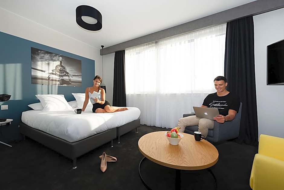 It's a shame we were only here for one night... Lovely modern and clean hotel overlooking a small airfield with parachuting (no noise disturbance though). Room was very clean and comfy with a lovely big shower, a kettle and selection of teas/coffee. Staff were friendly and there was a reception bar with outside seating overlooking the airfield so you could sit and have a drink watching the parachuters. 5 minutes walk from the bus stop with a direct route to Lille Europe/Flanders stations.