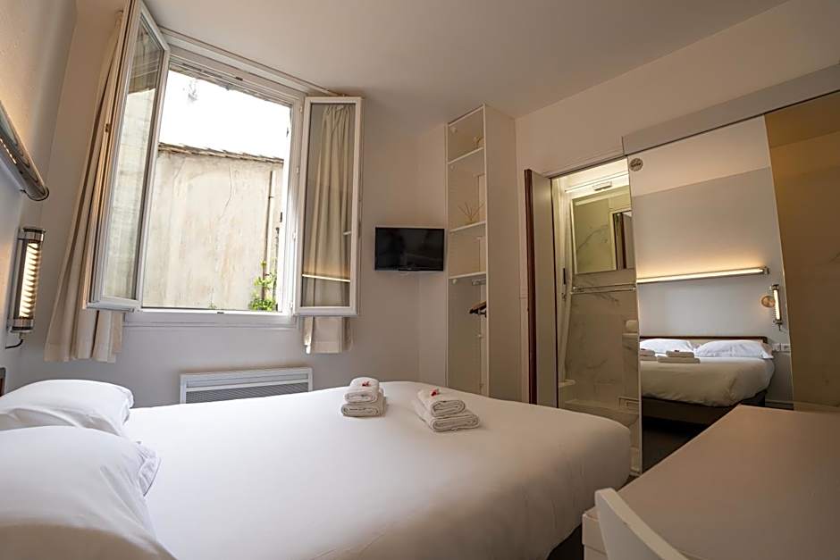 The Brit Hotel Des Grands Hommes - Bordeaux Centre offers a variety of rooms including double rooms, twin rooms, double rooms with small bathrooms - courtyard side, and triple rooms. The rooms have an average size of 118 sqft for double and twin rooms, and 108 sqft for double rooms with small bathrooms. Smoking is not allowed in any of the rooms. The rooms can accommodate between 2 adults and 1 child, and 3 adults, depending on the room type.