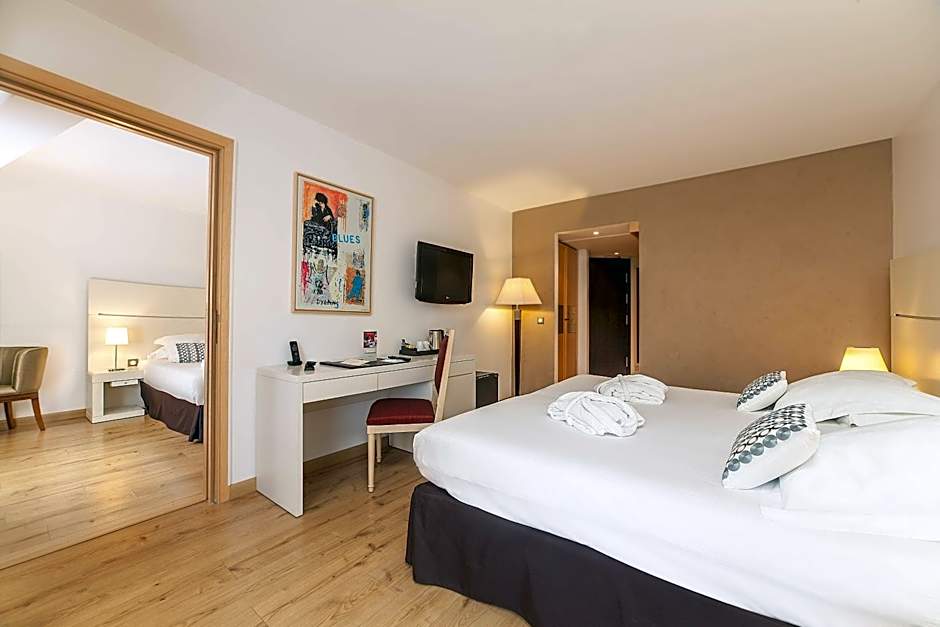 After a day of exploring Cannes, guests can further unwind in the hotel's indoor heated pool, perfect for relaxation all year round. The pool is open to all ages, offering a tranquil retreat for families and couples alike. Complete with a spa tub and hot tub, guests can enjoy a pampering soak or bask in the sun on the inviting sun deck or terrace. The indoor pool area provides a serene setting for guests to rejuvenate and enjoy some leisure time during their stay.
