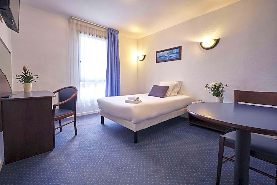 With a discount, I was paying less than £50 a night in July for a room for two people, with a kitchenette and bathroom with a really good shower, so I wasn't expecting luxury or beautiful gardens etc. The room was very clean and very quiet, with excellent air conditioning. Everything worked. The kitchenette was good enough (fridge with freezer compartment, microwave, kettle, coffee machine, two rings, extractor hood, dishwasher, sink) but would be better with an extra pan, a vegetable knife and corkscrew. The pool was quite small, but it was pleasant and clean and not much used, so we more or less had it to ourselves. The guy on the desk was very helpful, friendly and cheerful. Seating area outside was fairly small and could do with a little more lighting, but it was okay. Good car park; Carrefour quite close by and a good location if driving (there were bus stops nearby too). Towels and shampoo etc provided. TV fine.