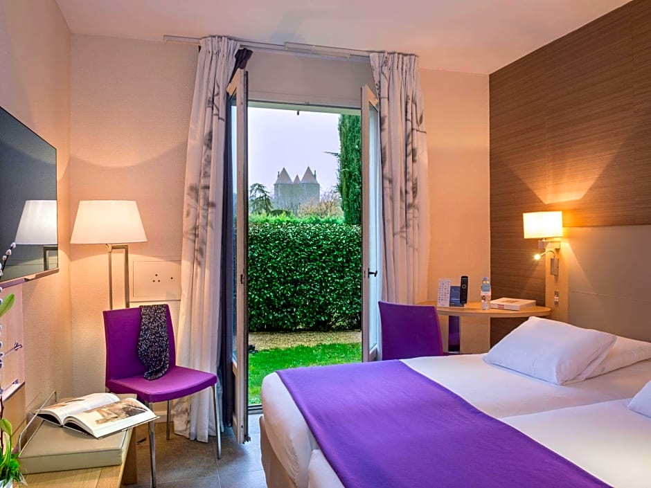 We loved this hotel and it is such good value for money. We stayed with our teenage son and two dogs and the room with the extra single bed was a perfect size. It had direct access to the garden which was so helpful with the dogs, morning and evening. We walked to the citadel which took us only 5 minutes. We could go back and forth to the hotel which made it all so easy, especially when our old dog needed rest. We had dinner in the restaurant that evening which was really superb. €30 for three courses. The highlight was creating your own salad of 5 items with a little pick and choose form for starters. Lemon meringue tart for dessert also! Such lovely serving staff topped it off. I highly recommend this hotel if staying in Carcassonne. A lovely pool, outdoor restaurant and terrace, reasonable breakfast and so close to the citadel.