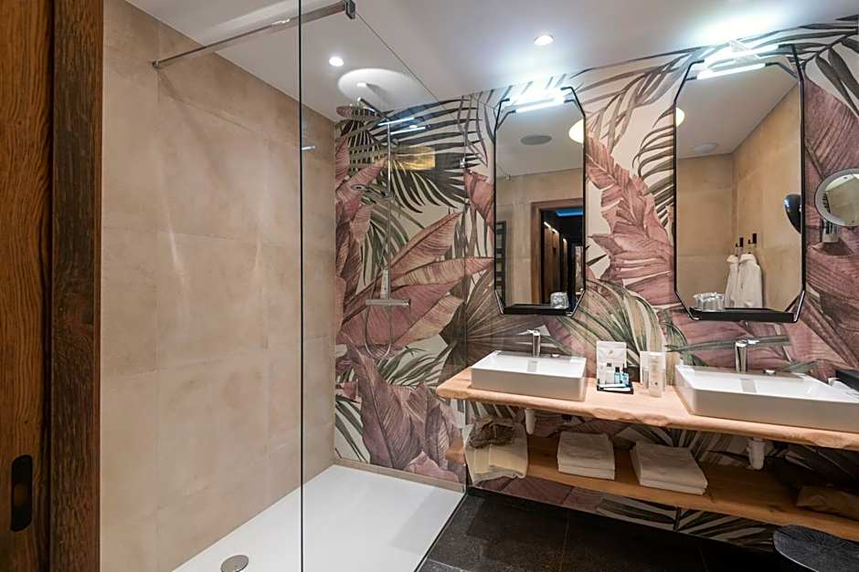 Accessed directly by a elevator, this suite is set in a loft style and features a private terrace with a hot tub and panoramic views. It is decorated with wood and natural materials and the bathroom with its bathtub, shower and double sink is open onto the room.