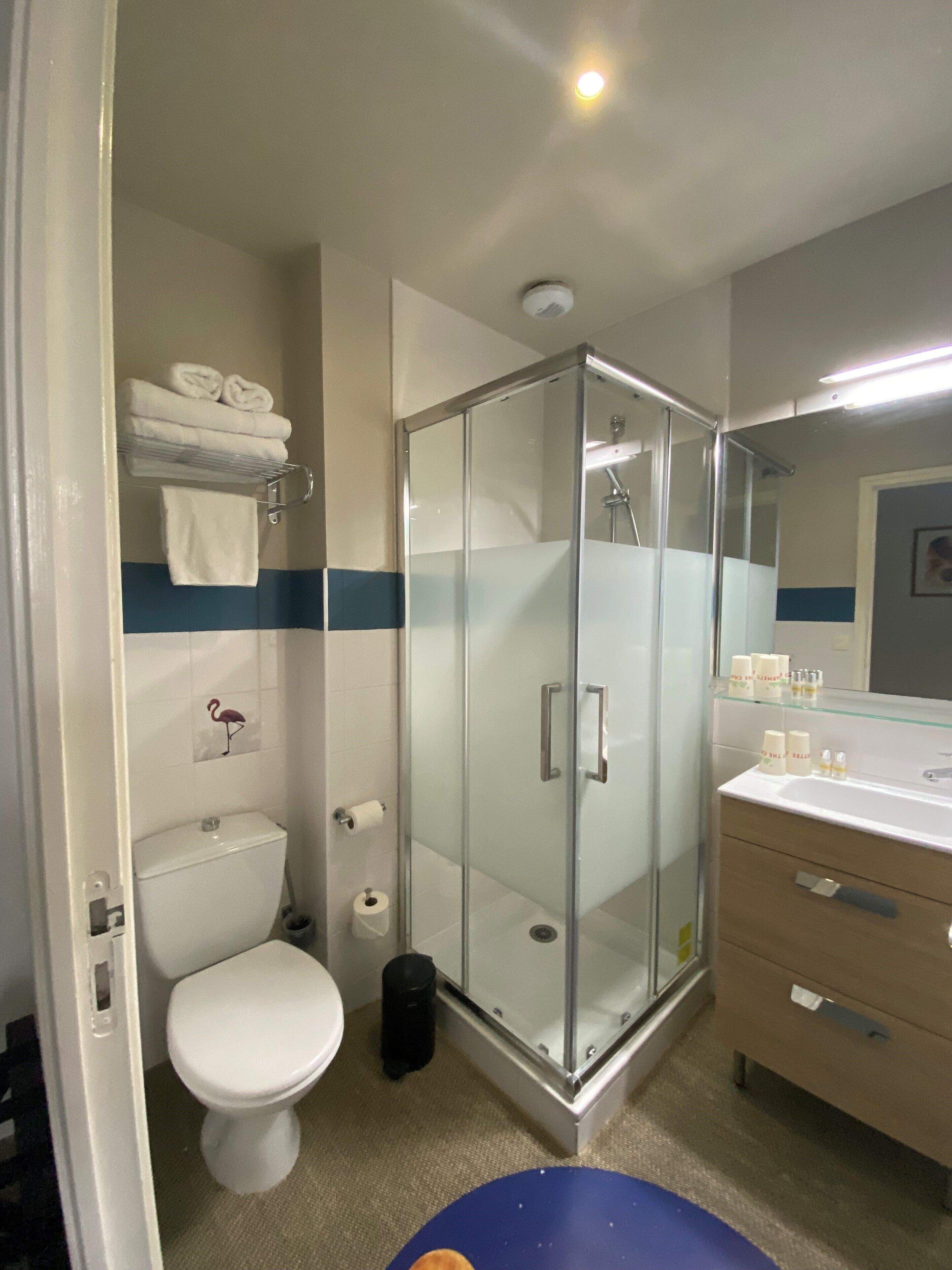 Staff were very friendly and helpful. Reception staff allowed me to check in early as my room was ready which I greatly appreciated. The room was in the annexe and was very clean, with a kettle, coffee and tea which was very welcome. There was also a fan as the room was on the 2nd floor and the room did get hot while I was there so I was glad of the fan. There is no lift so you need to be aware you need to carry your case up the flights of stairs. I really enjoyed breakfast with the sea view and it was great that there was a restaurant on site as St Malo was very busy . You need to make a reservation for the restaurant as it gets very busy. The hotel is 25 mins from the station and 30 mins from Intro Muros.