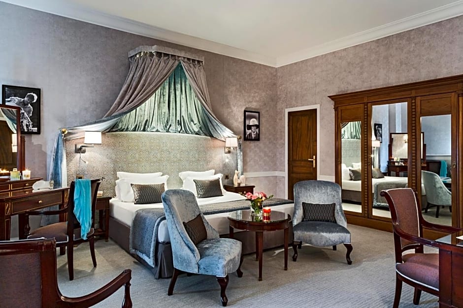 With views of the sea, this air-conditioned suite is decorated in warm shades of colors. It includes a 4-poster bed, a 50-m2 lounge, a dressing room and a bath or separate shower.