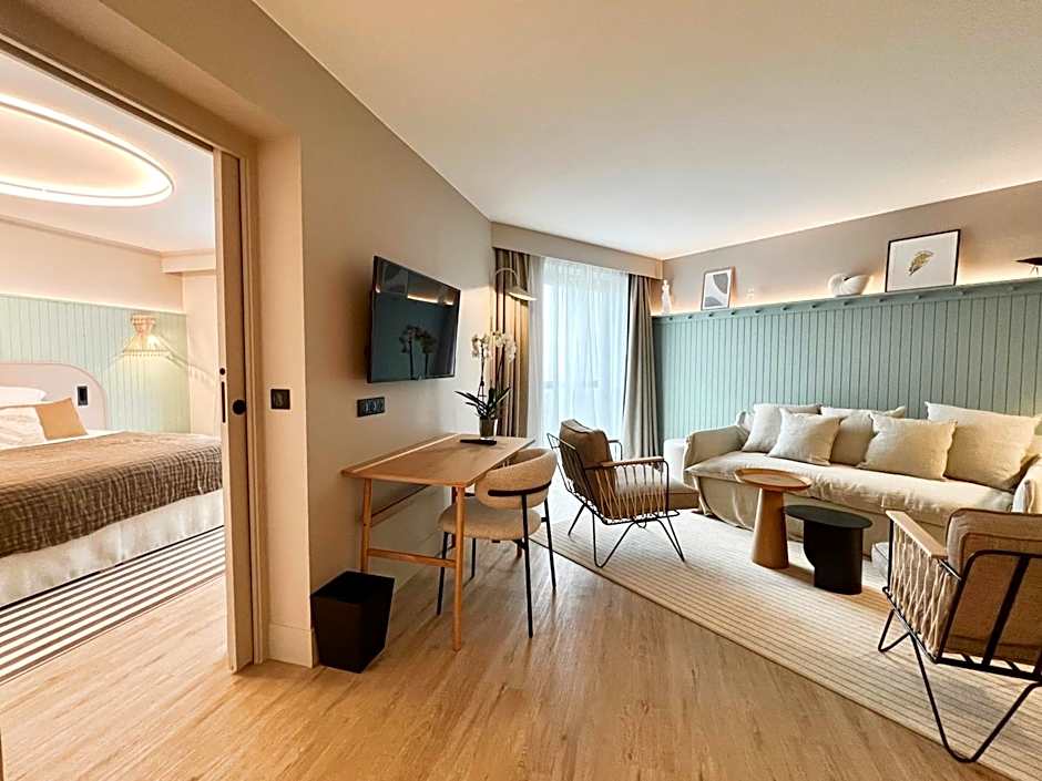 Renovated Junior Suite, on the sea side, is composed of a bedroom and an independent living room. The room has a large kingsize bed, an private bathroom with a bath and a shower and bathrobes. The living room is equipped with a sofa bed that can accommodate up to two people, a desk, a flat screen TV and a Nespresso coffee machine. You will benefit from a complimentary soft drinks mini-bar and a wellness amenity in the bathroom. You may add a baby crib.