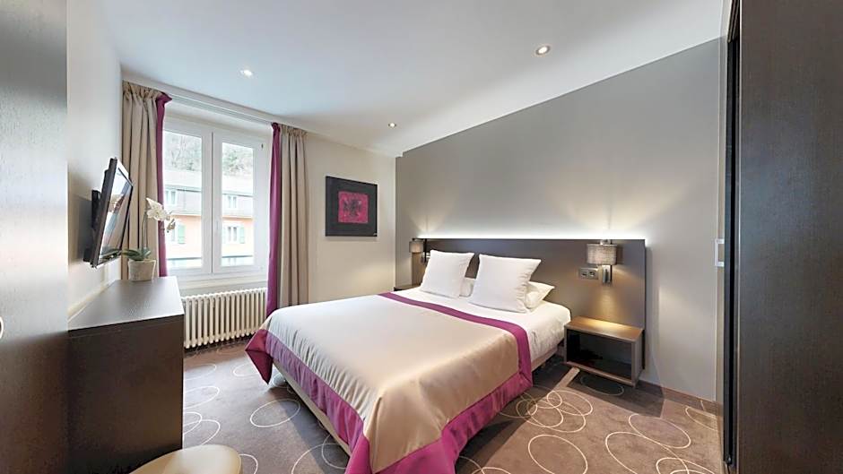 is a four-star retreat in Évian-les-Bains, France. Address: Route des Bains 48. Located from the city center, it offers mountain and garden views along with a terrace for relaxing moments. Minimum price starts from .