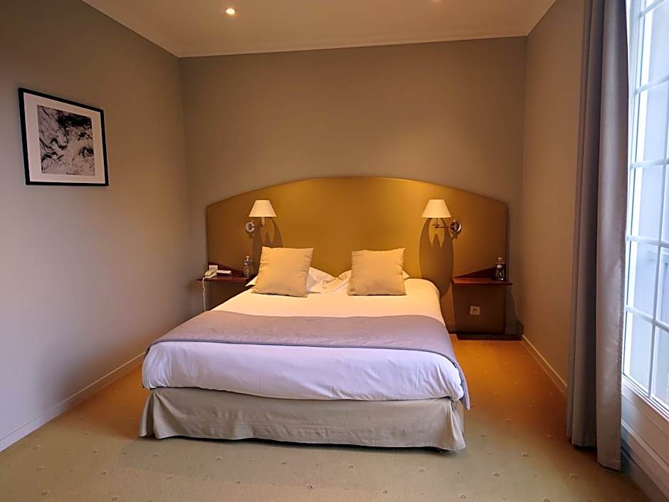 we have stayed before. the first thing we do is strip the bed and start again as they use the thickest duvets and it was very hot at the end of June. No AC. the road outside can be a bit noisy BUT it does quieten down later... the bed is very very comfy in fact 2 doubles pushed together so plenty of room. very good shower and nice sized bathroom. nice quiet room at the end of the corridor so no elevator noise or being disturbed by other guests which is great as we had the dog with us. very safe/plenty of room for parking. Good restaurants within walking distance - we will stay again and we do recommend - just 2 hours from Le shuttle too.