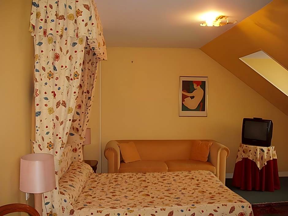 The location of the hotel was just a few minutes walk to the centre of Honfleur. Our room was in the annexe to the hotel and was full of charm and very spacious. There was a big garden full of interesting wood sculptures and the whole hotel was very interesting and 'quirky'. There was a good buffet breakfast.