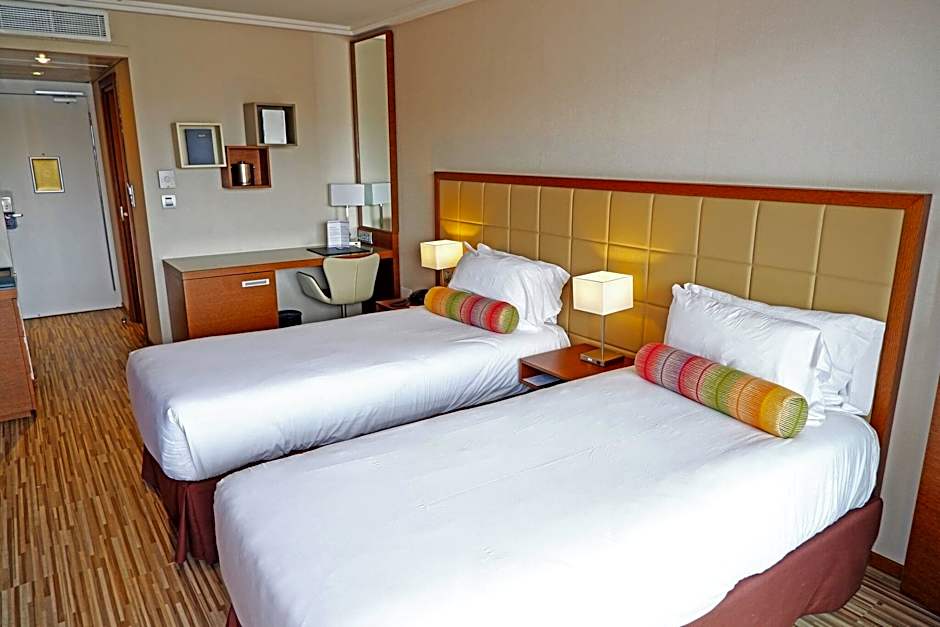 Family Suite, 2 Twin Beds, Non Smoking, City View is 431 square feet and includes a double bed 131-150 width plus extra beds on demand, desk, cable tv, hairdryer, tea and coffee making facilities , ironing set, and safe.