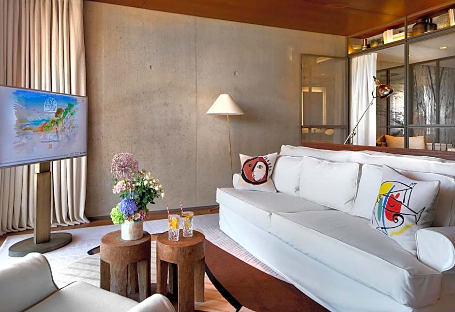 This suite has a living room and a 98 feet² private terrace with sun loungers. It has a bathroom with a bathtub and a shower. It also features view of the wellness center.