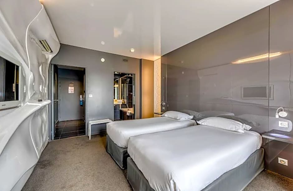 Everything you need from a modern conveniently located stop over aparthotel on a new out of town retail estate with bars, cafes, (good) boulongery, restaurants and supermarkets within a few meters. Not a fan of the plastic wall panels or seedy red lights above doors in corridor, but each to their own. Friendly, helpful staff and good email communications. No prob keeping bike (velo) on room balcony. Decent breakfast (but no fruit), comfy beds and quiet. Location on booking.com not quiet correct but you can find it on Google maps. It's not walking distance from the coast.