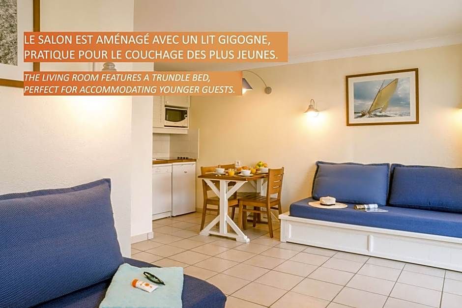 This apartment with sea view features a living area with 1 single sofa bed and one pull-out bed (recommended for children). There is one bedroom with a double bed. It has one independent bathroom with a bath. The fully equipped kitchenette opens on the living area. You are kindly requested to clean the kitchen area before departure. You can book an apartment with a panoramic sea view using the "Preferred Location" service. Some accommodations are located on the seafront and benefit from a clearer sea view (at an additional cost and upon reservation. Contact reception.