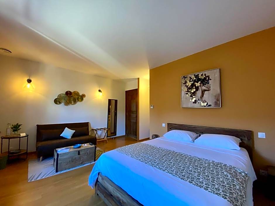 This double room has a connected flat-screen TV, a private terrace and direct access to the garden and the swimming pool.