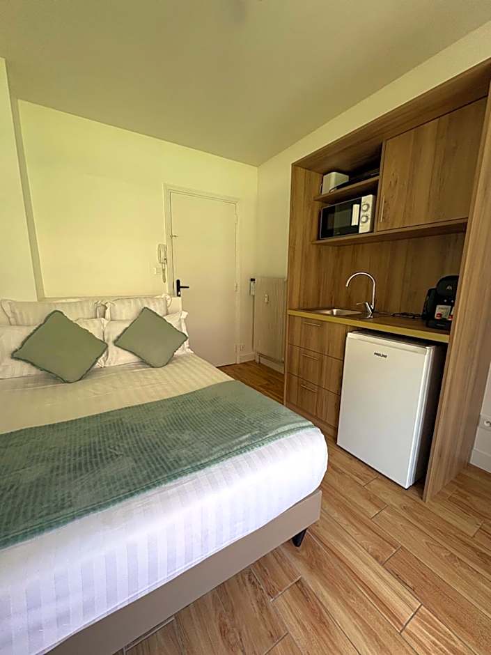 A flat-screen TV with Canal+ channels is offered in this room. There is also a private bathroom with separate toilet, and a balcony.