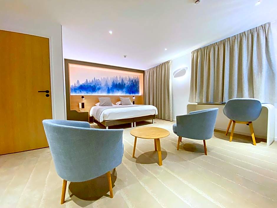The Brit Hotel Piscine & Spa - Fougères offers a range of room types including Deluxe Studios, Family Rooms, Twin Rooms, Junior Suites, Superior Double Rooms, and Double Rooms. Smoking is not allowed in any of the rooms. Accommodations range from 205 sqft to 700 sqft, with bed sizes including King size, Double, Twin, and Queen size. All rooms can accommodate 2 adults, with some allowing space for an additional child.