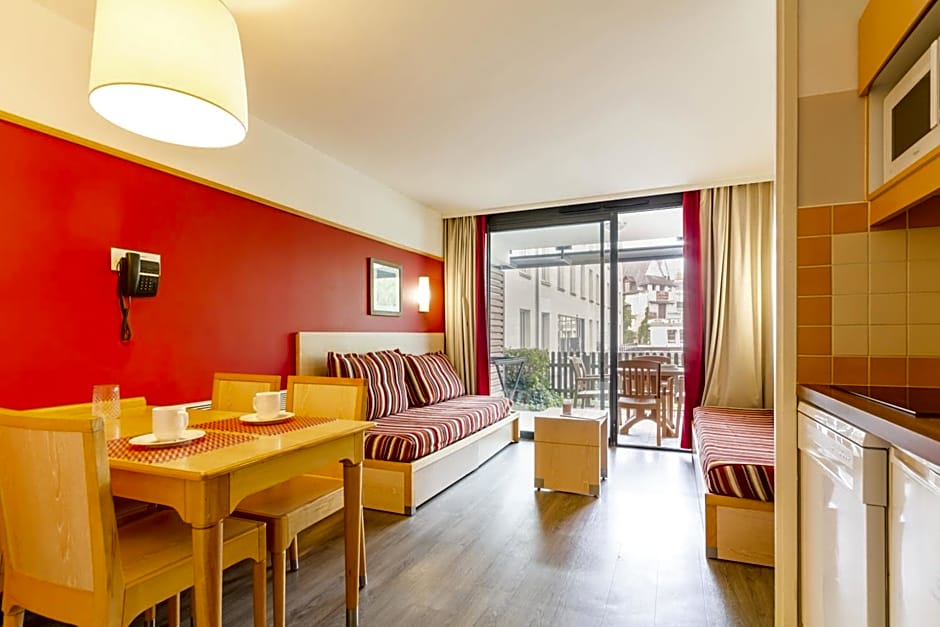The location is fabulous. We loved being in the centre of town. It was nice to be able to walk to bars, shops and restaurants. Be sure to book a room with a balcony / garden or you will have no outside space at all. As after the pool closes there is nowhere else to sit outside on site. Apartments were well equipped, especially with kitchen utensils. We made use of the Navette to the zoo / Château's that stops right outside and is excellent value.